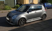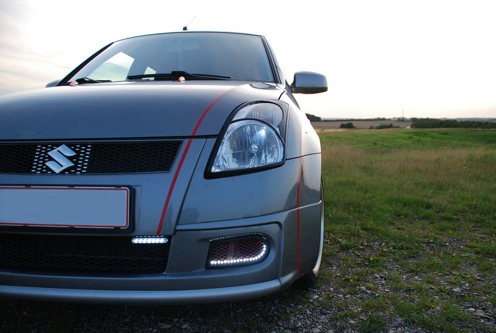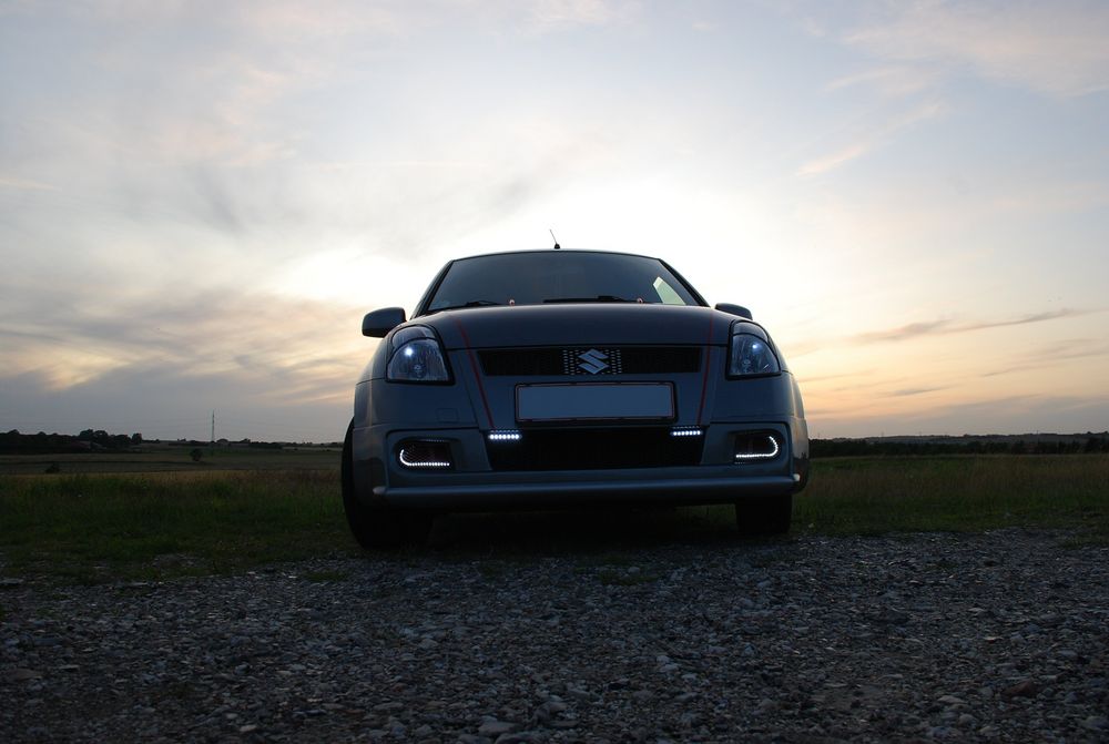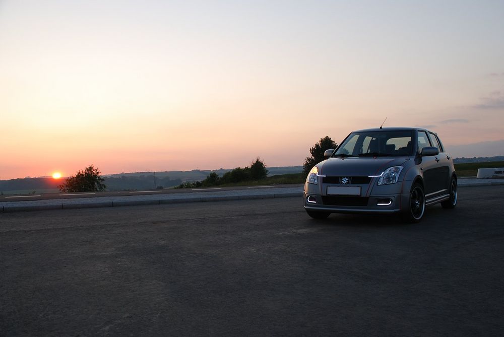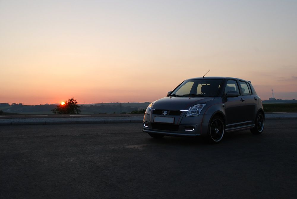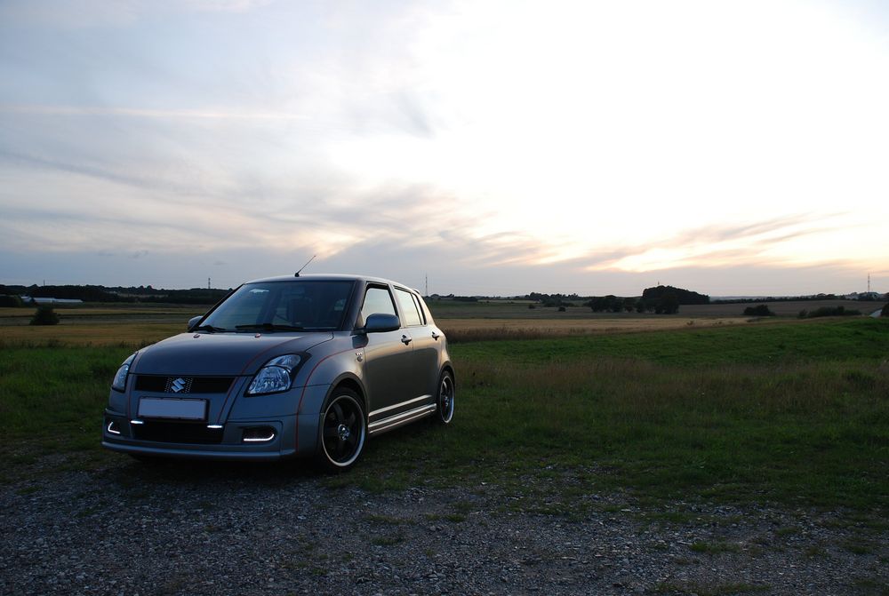 Lækker baggrund + nye lygter.. En flot baggrund.. Så fik Swiften briller på.. Billeder ved solnedgang vil ALTID være flotte.. Nice..:D Lækkert at stå på en top ved solnedgang.. Uden blitz.. Så kan det se lyst ud.. Ja, for mørkt var det ikke men lækkert ser det da ud..hehe Suzukiswift.dk mærket er på..:o) Så kom mærket på.. Sorte striber er nu ret lækkert sammen med de røde..